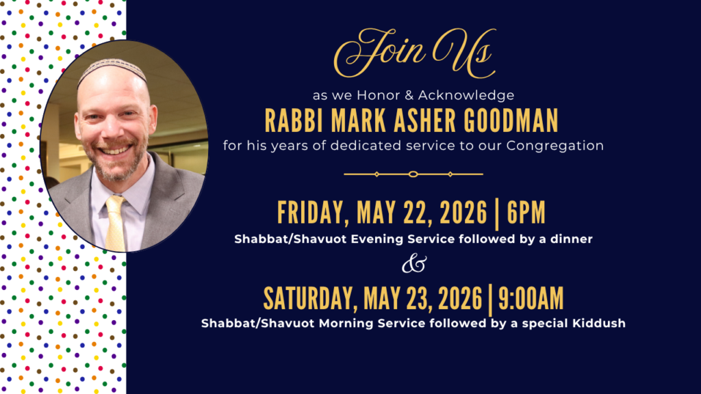 Join us as we honor and acknowledge Rabbi Mark Asher Goodman for his years of dedicated service to our Congregation.