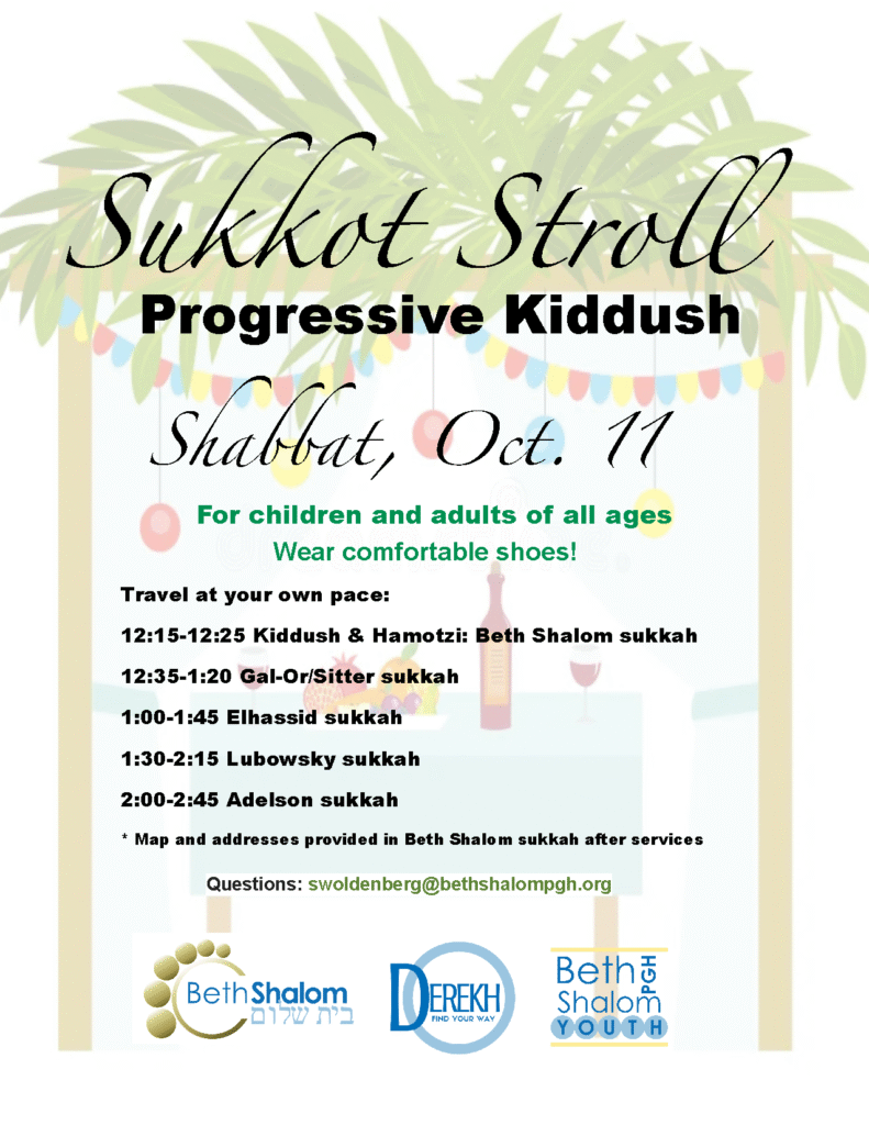 Sukkot Stroll with Progressive Kiddush – Saturday, October 11, 2025 October 6, 2025 Last updated : October 6, 2025 Beth Shalom Questions? Email Shari Woldenberg at swoldenberg@bethshalompgh.org